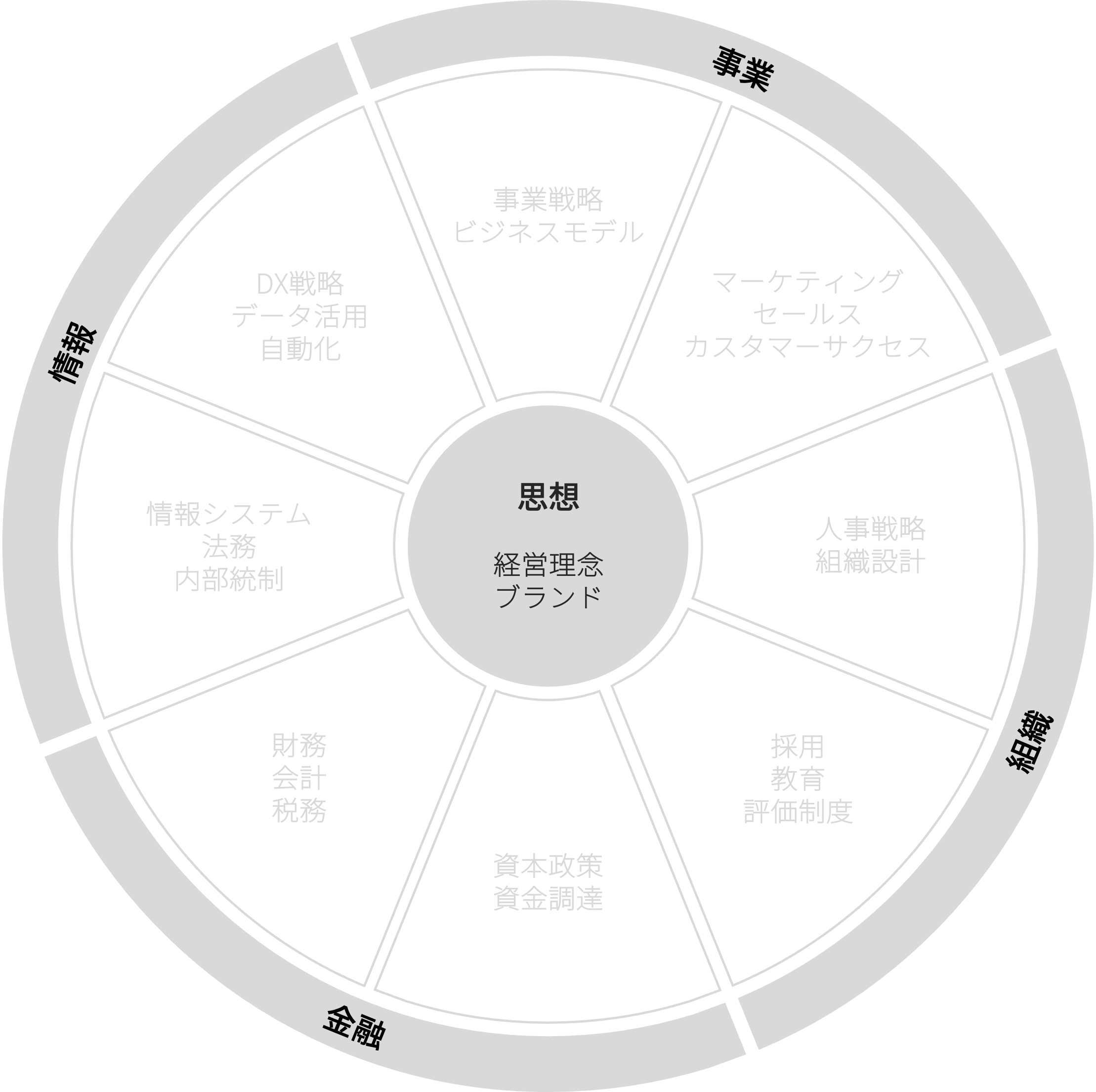 経営の課題は、領域を跨いで連鎖する。思想を中心に各領域を設計し、経営を構造化します。