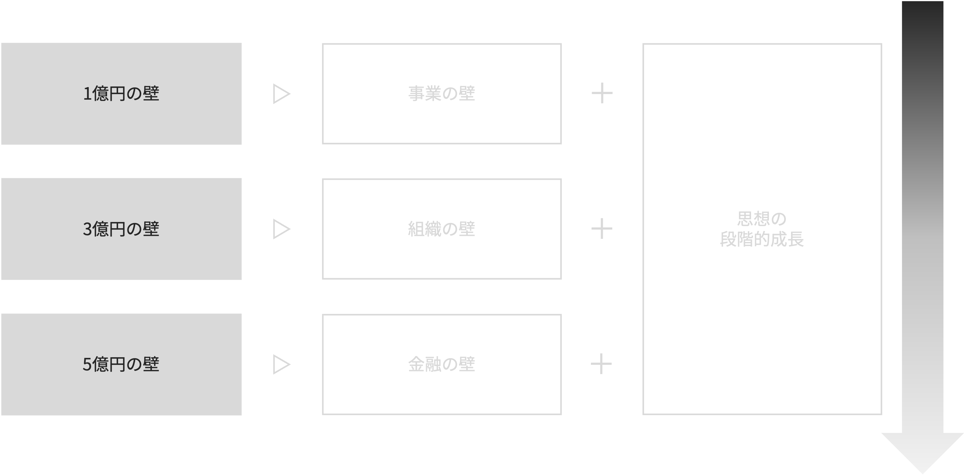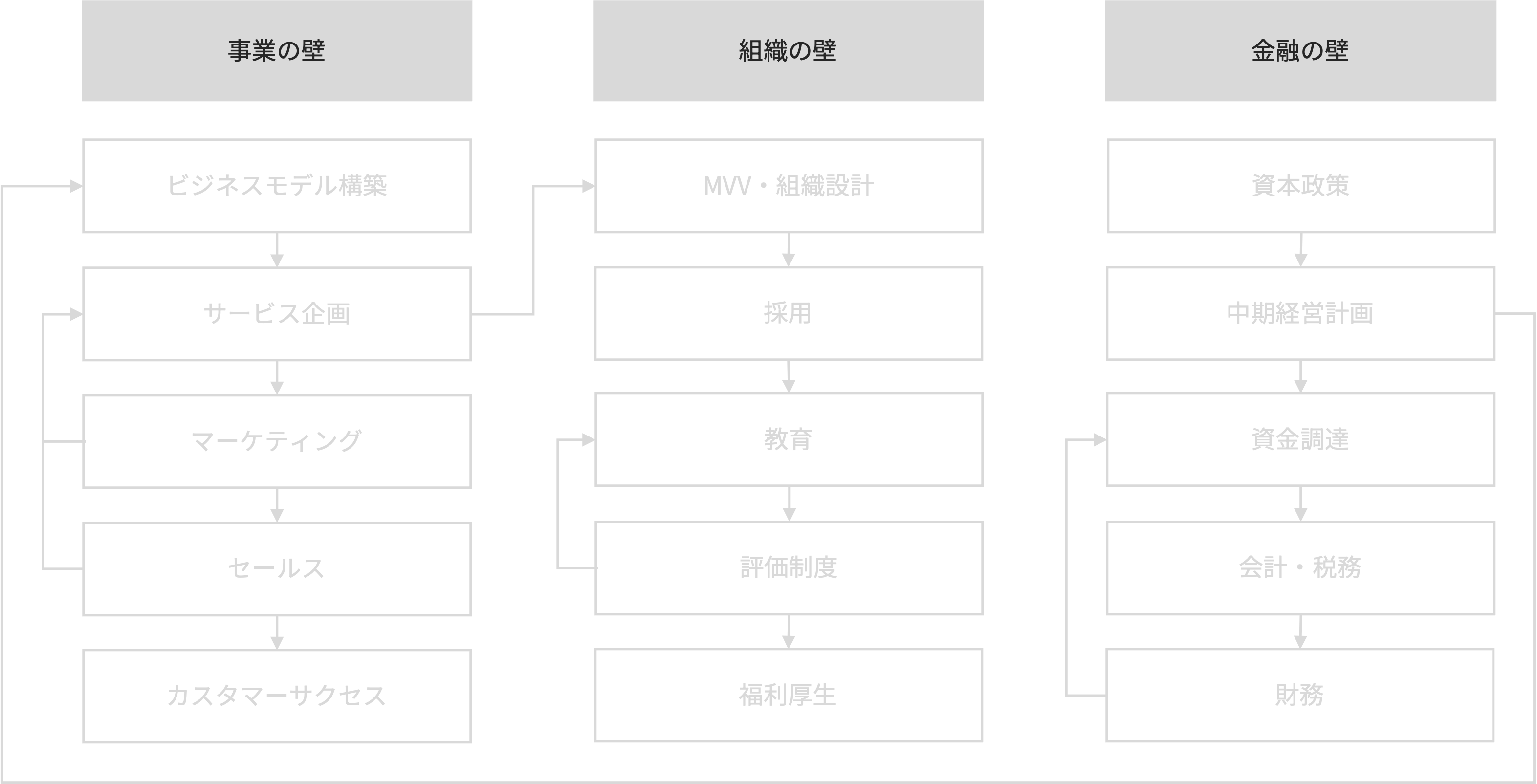 企業の成長には「壁」があります。 この壁は企業・事業の成熟度によって異なり、事業・組織・金融の施策によって越えることができます。